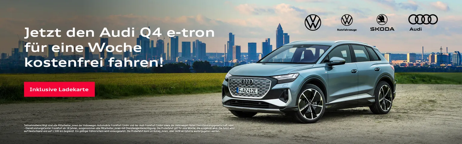 Teilnahmebedingungen: Teilnahmeberechtigt sind alle Mitarbeiterinnen und Mitarbeiter der Volkswagen Automobile Frankfurt GmbH, der Audi Frankfurt GmbH und der Volkswagen Retail Dienstleistungsgesellschaft mbH (Standort Frankfurt) ab 18 Jahren, ausgenommen alle Mitarbeiterinnen und Mitarbeiter mit Dienstwagenberechtigung. Die Probefahrt gilt für eine Woche, die ausgelost wird. Die Fahrt wird auf Deutschland und auf 1500 km begrenzt. Voraussetzung ist weiterhin ein gültiger Führerschein. Die Probefahrt kann an Kolleginnen und Kollegen, aber nicht an Externe weitergegeben werden.